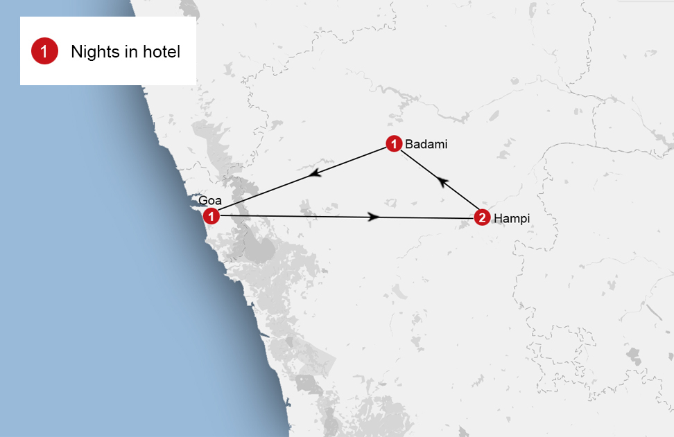 From tropical Goa, the journey to the southern state of Karnataka to discover the wonderful ruins of medieval Hampi, the rock cut caves of Badami & the stunning temples of Pattakal & Aihole.