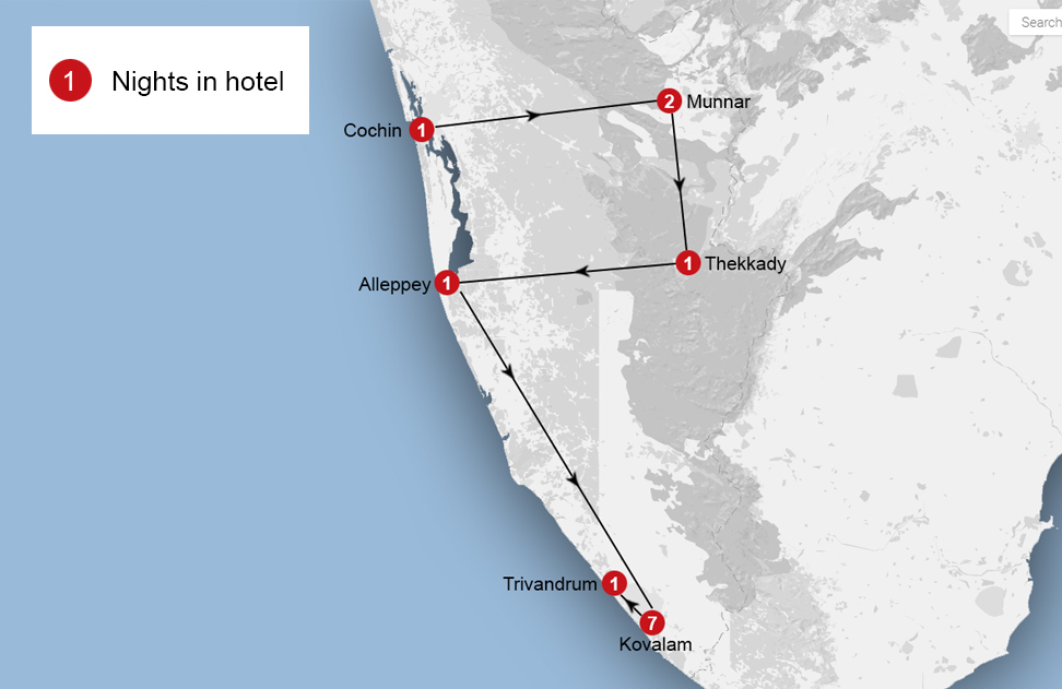 After breakfast, drive to hill station Munnar and explore rich flora and fauna and lush green tea, coffee, spice plantation, Eravikulam National Park and more. Get Ayurvedic therapies at your hotel and stay overnight at your hotel room.