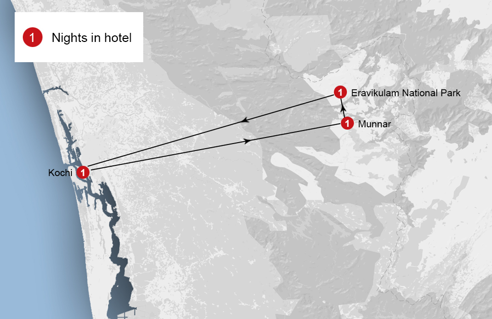 Kochi – Munnar. Drive from Kochi to Munnar. A hill station at a height of 1525 meters, Munnar offers a breathtaking view of the hills swathed in an impossibly green carpet of tea bushes. Munnar – the right royal resort lazily nestled in the verdant slopes of tea country, is a quaint tiny town that exudes a rare elderly world charm and strangely reminds of the days of the Raj in its elegant splendour. Beyond the rolling hills discover the rich tropical forests abounding with exotic flora & fauna. It is here that you will find the Anamudi peak, the highest peak in the Western Ghats, in South India. Overnight – Munnar