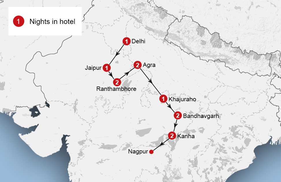 This well crafted 12 day holiday includes three of India’s best known Tiger reserves and National Parks namely Ranthambore, Kanha and Bandhavgarh. This tour also includes some of India’s best known cultural tourist attractions such as the bustling metropolitan city of New Delhi, the Pink city of Jaipur, the city of the Taj Mahal – Agra and the erotic temples of Khajuraho. Kanha and Bandhavgarh are well known Tiger reserves, but also support a whole lot of flora and fauna. It is a perfect holiday package for wildlife enthusiasts who want to combine the best tourist attractions of Northern India.